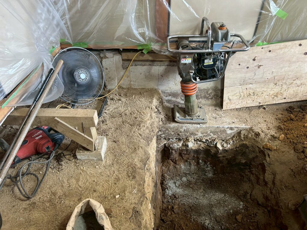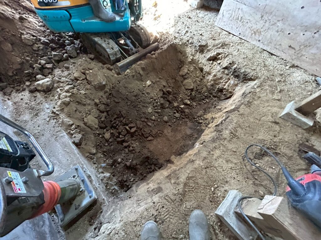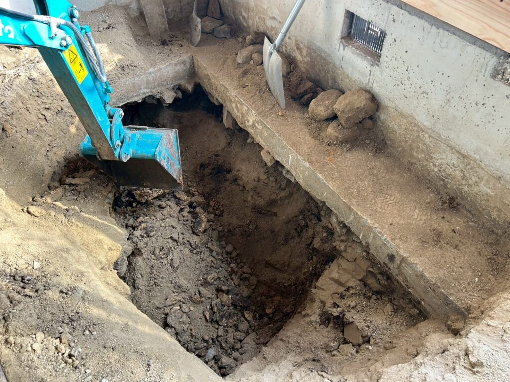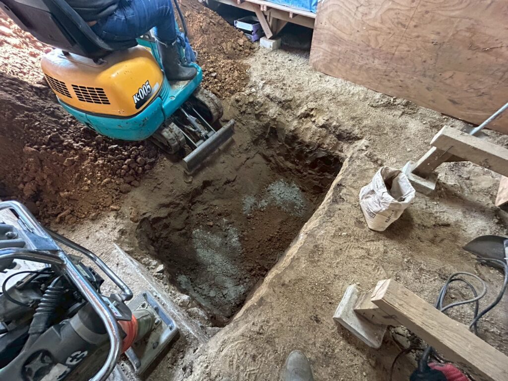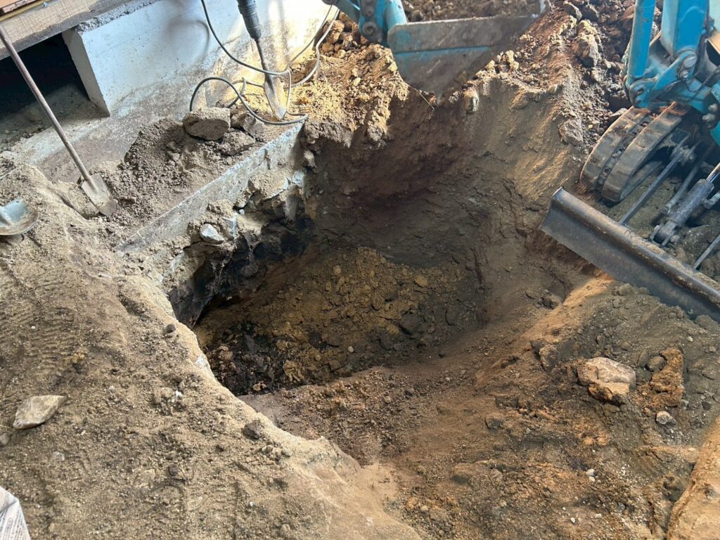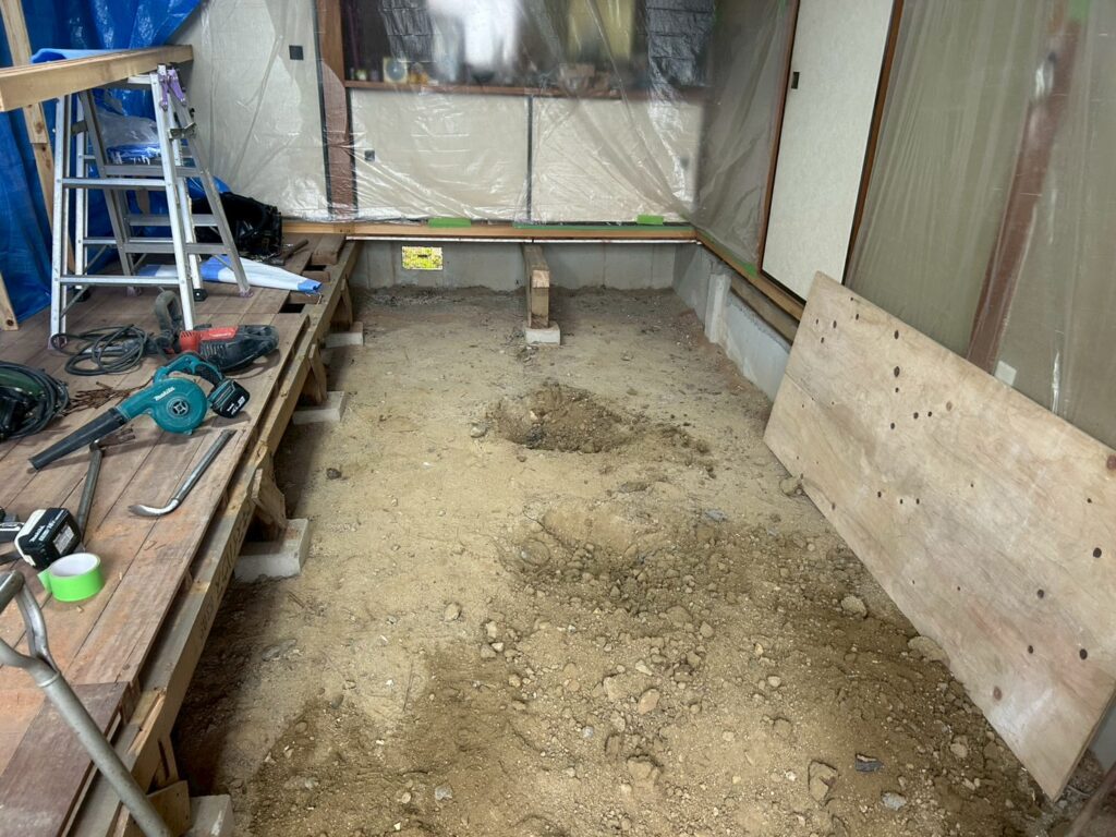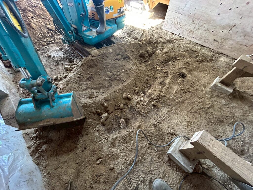また外部にて地盤の崩れが見られたため重機にて床張替部分の掘削、確認、埋め戻し(地盤補強)を行いました。