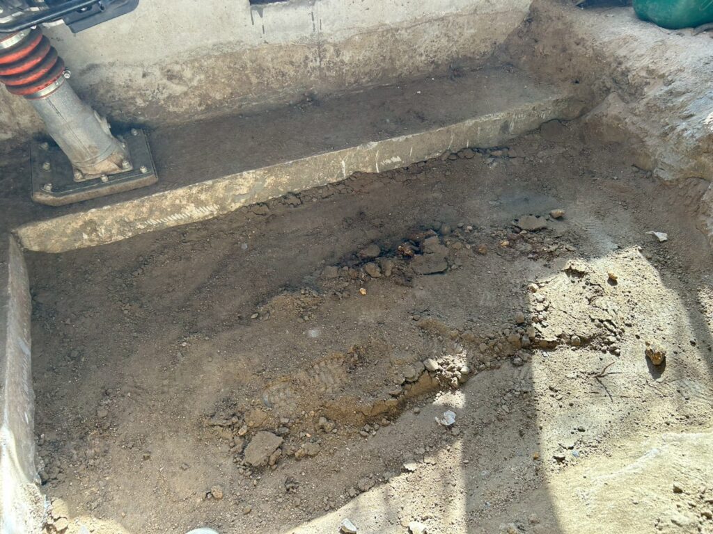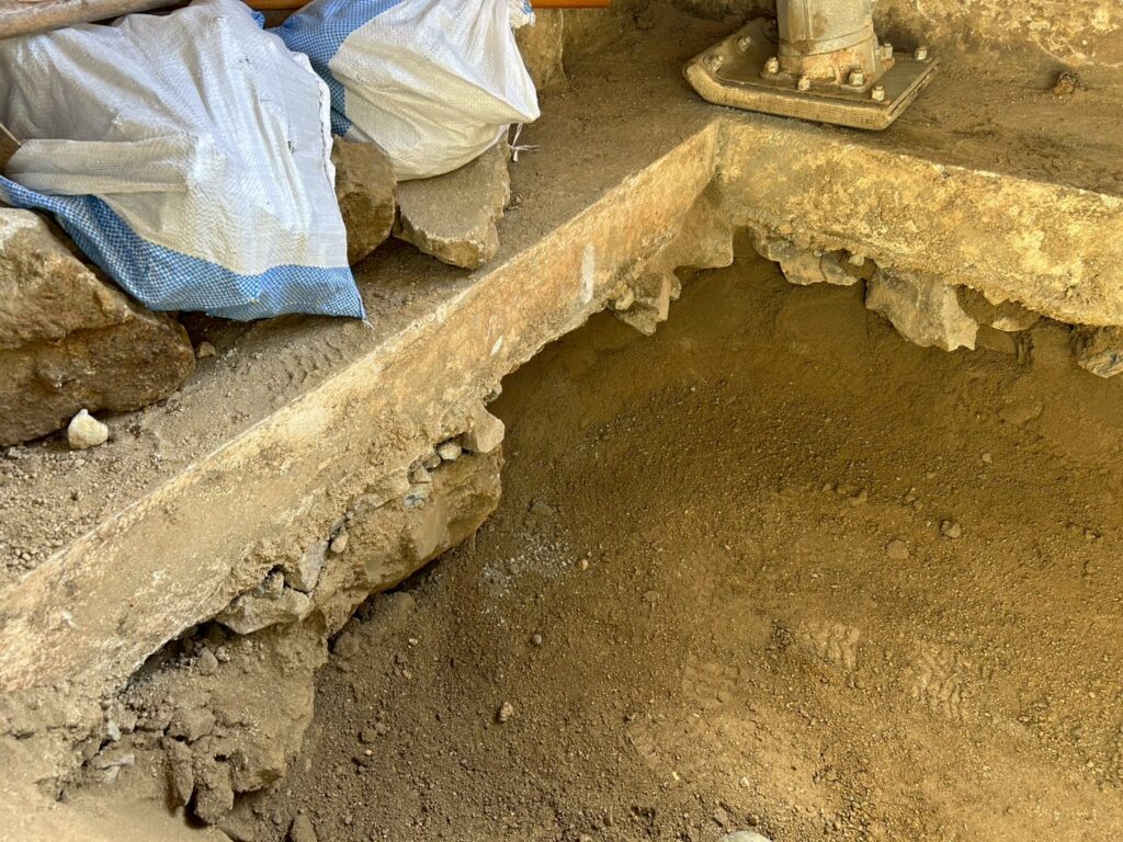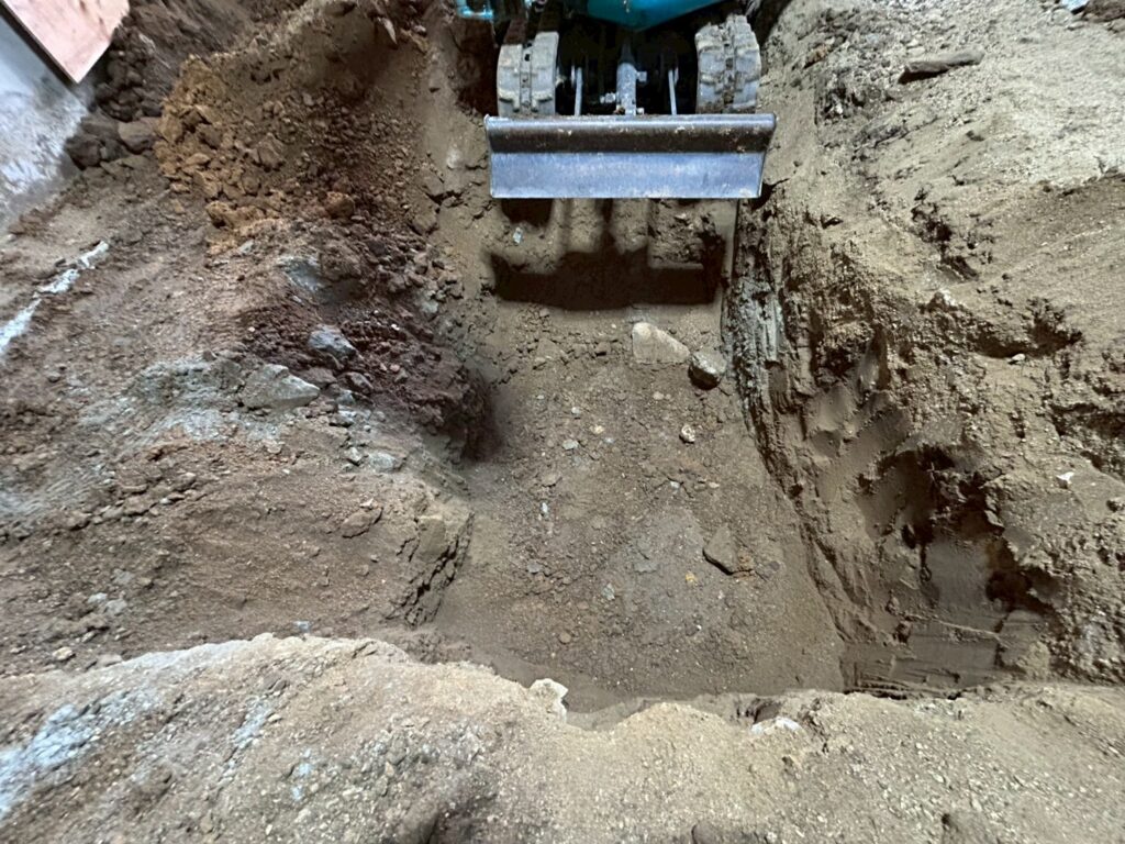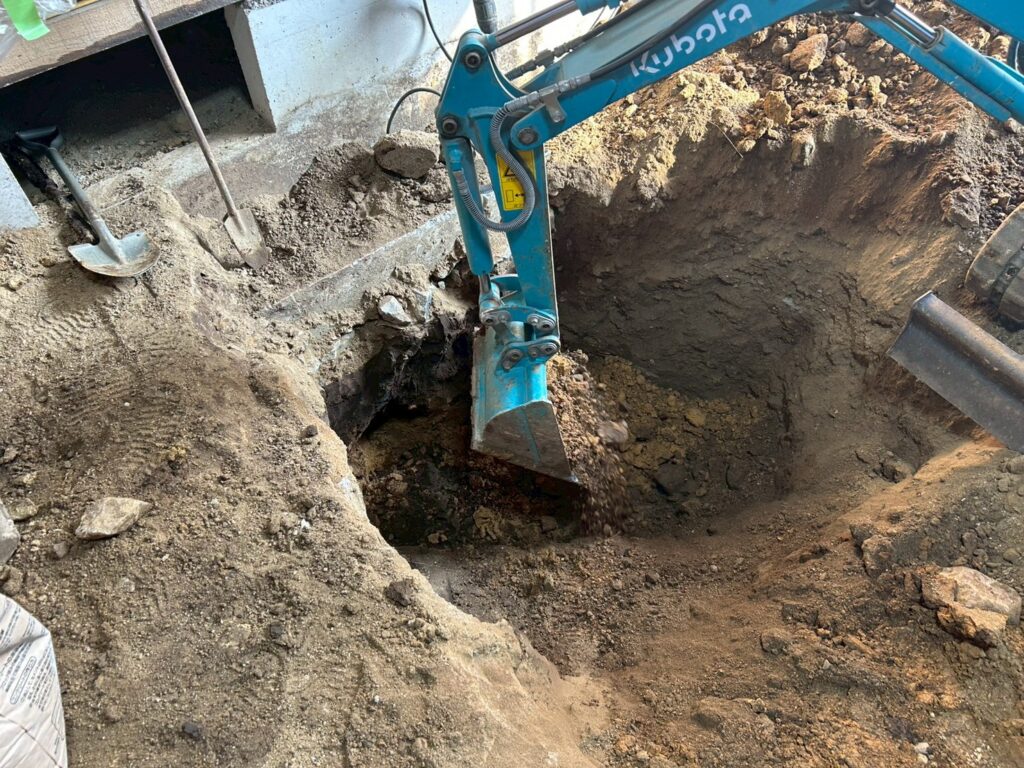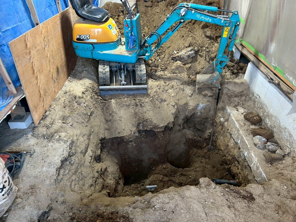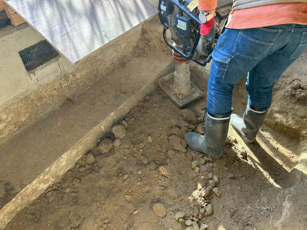 また外部にて地盤の崩れが見られたため重機にて床張替部分の掘削、確認、埋め戻し(地盤補強)を行いました。