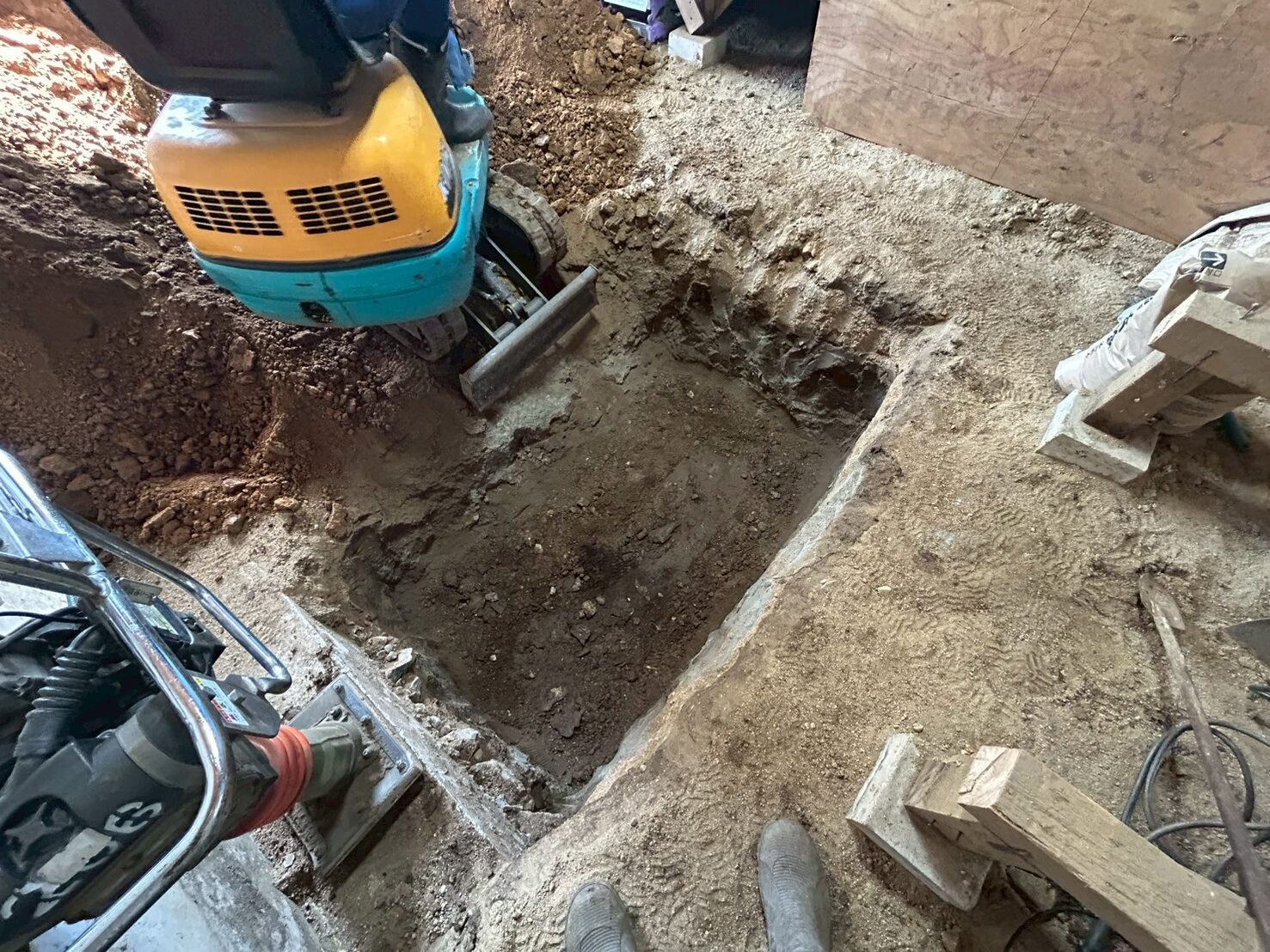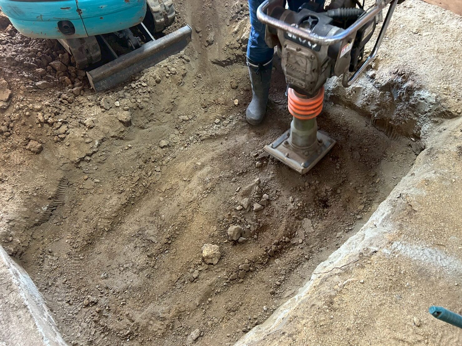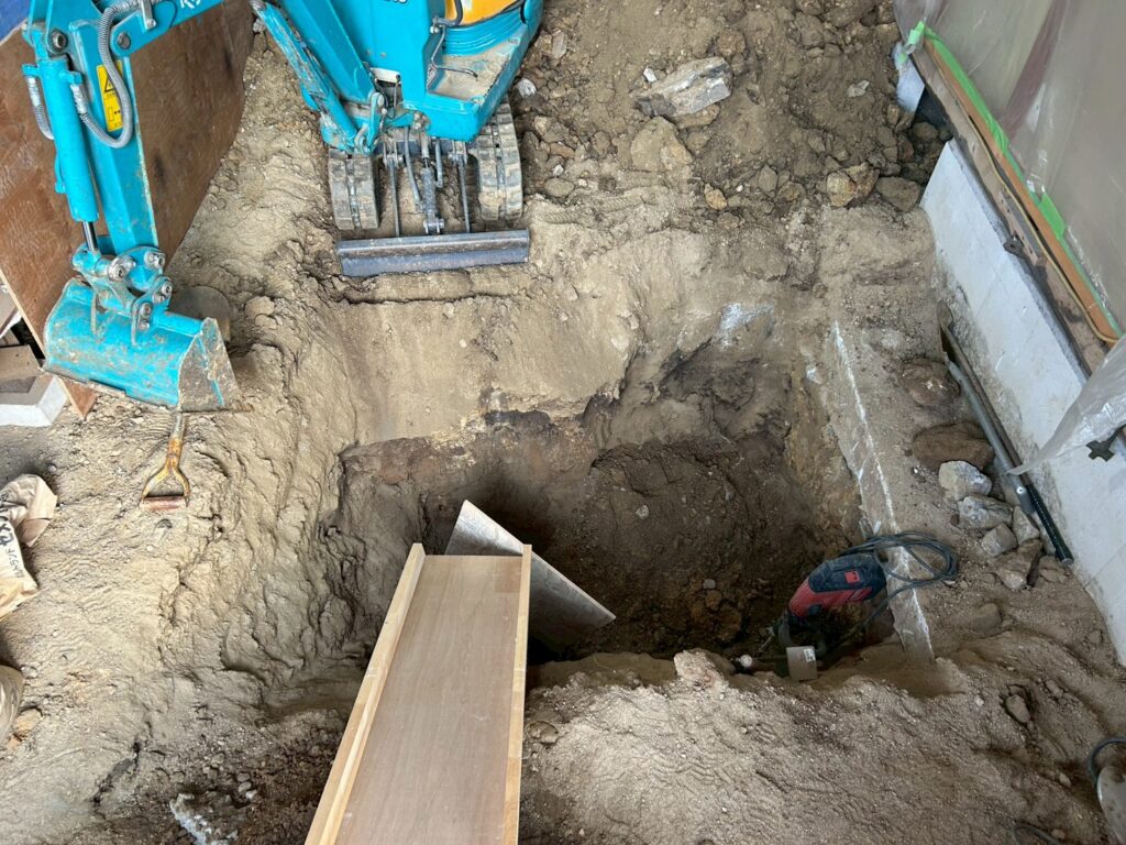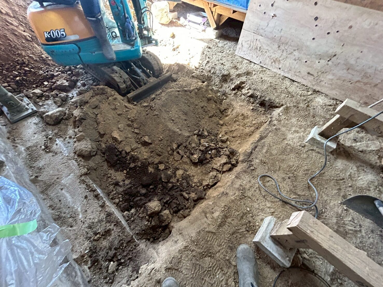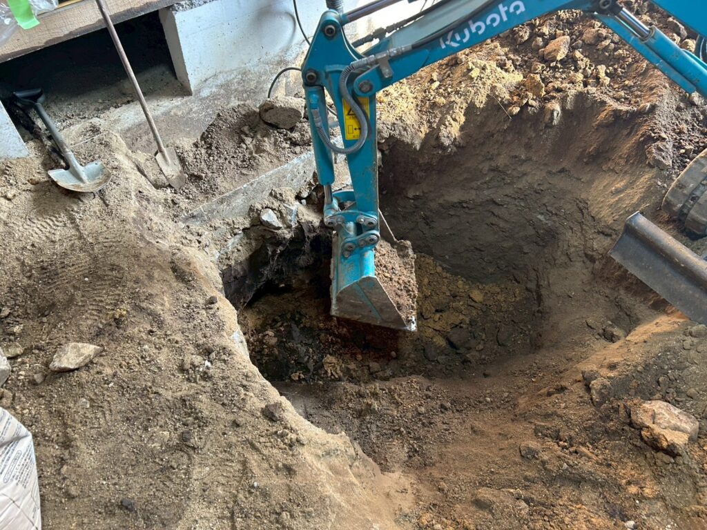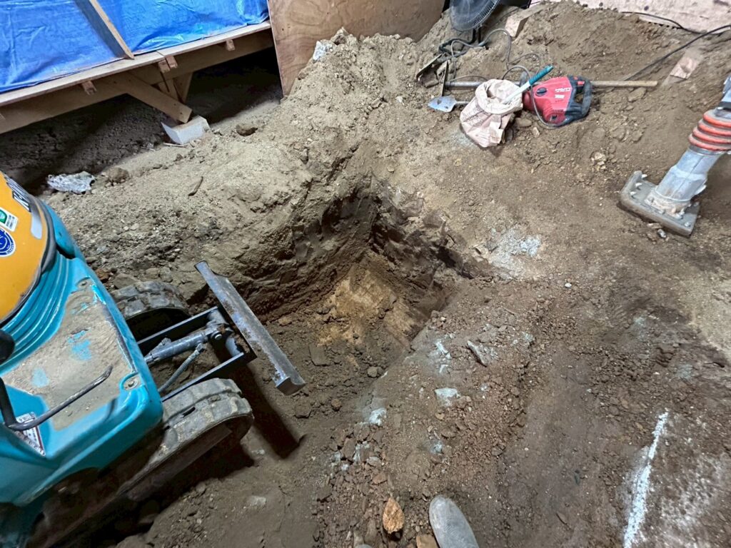 また外部にて地盤の崩れが見られたため重機にて床張替部分の掘削、確認、埋め戻し(地盤補強)を行いました。