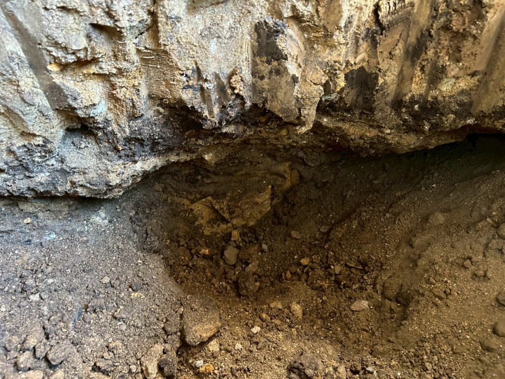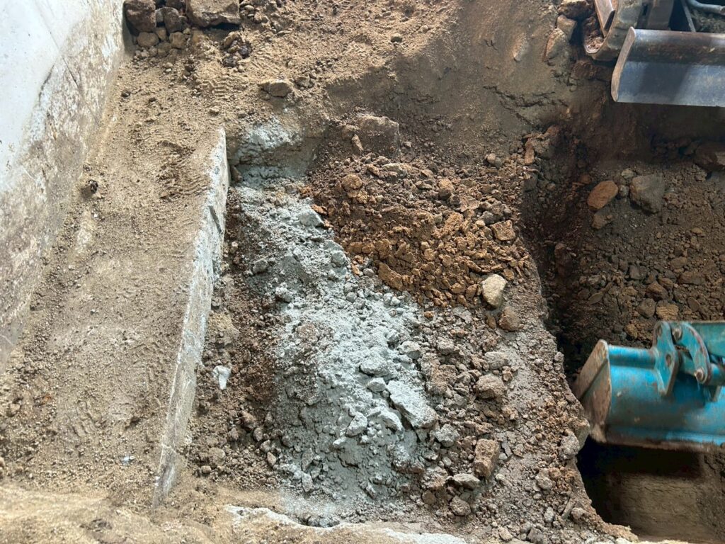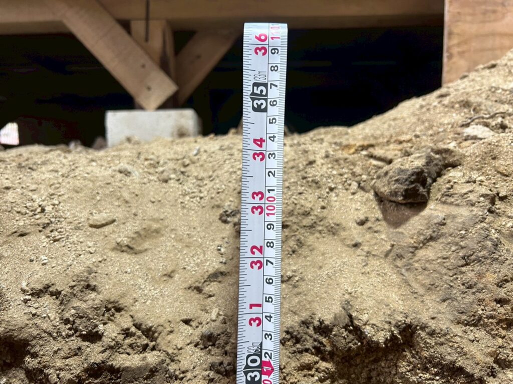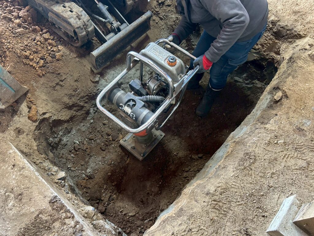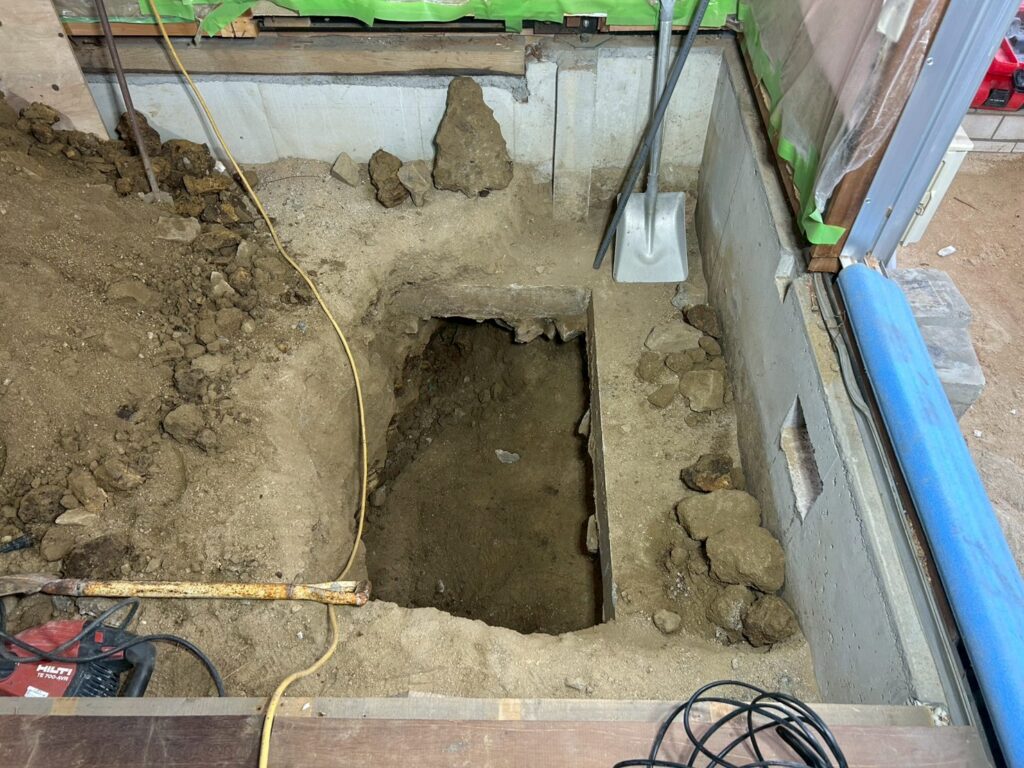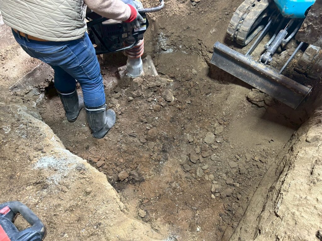 また外部にて地盤の崩れが見られたため重機にて床張替部分の掘削、確認、埋め戻し(地盤補強)を行いました。