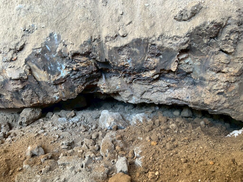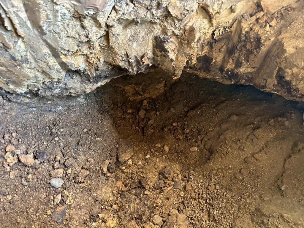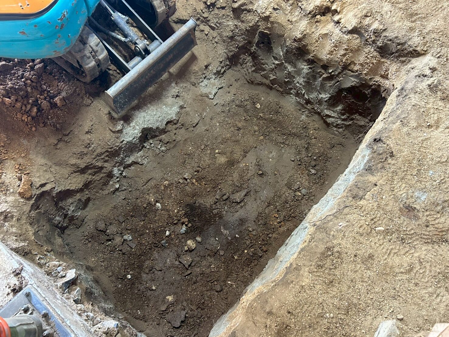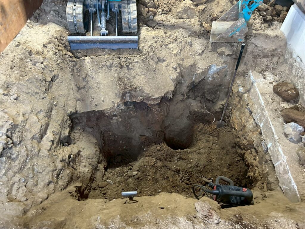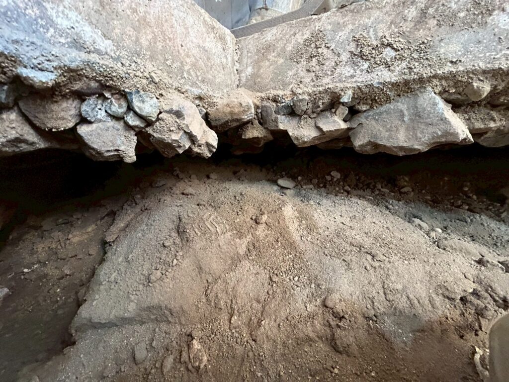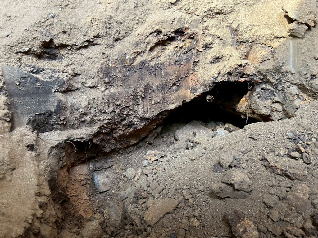 また外部にて地盤の崩れが見られたため重機にて床張替部分の掘削、確認、埋め戻し(地盤補強)を行いました。